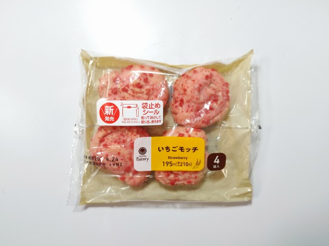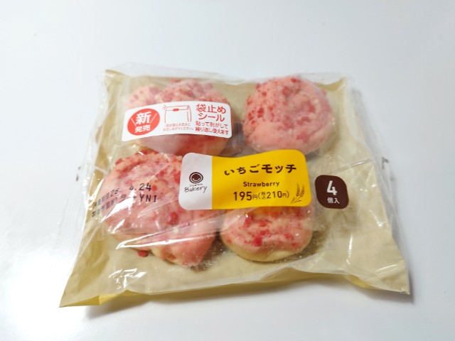 いちごを使った菓子パンです。以前にいちごモッチ(2025年5月27日発売)がありましたが、今回は4個入ミニサイズになっています。そんないちごモッチですが、いちごクリームが折り込まれた生地もちもちとした食感歯切れの良さいちごの風味があって、美味しいのひと言です。また、生地の全面にはいちごコーティングとトッピングとしていちごクランチホワイトクランチがのっていて、いちごコーティングいちごチョコの甘みトッピングいちごクランチホワイトクランチは、いちごの味わいビスケットの味わいで、味や食感のアクセントになっています。見た目ほど甘みは強くないので、甘いのがちょっと苦手な方にも食べやすい菓子パンになっていると思います。4個入ですが、1個ふた口サイズくらいなので、一人でも普通に食べ切れます。もちろんシェアするにもピッタリです。ぜひいちごモッチを食べてみてください。