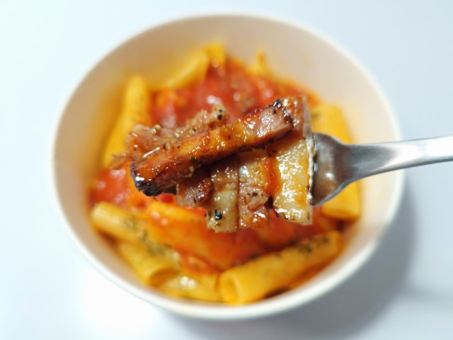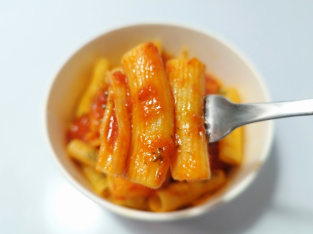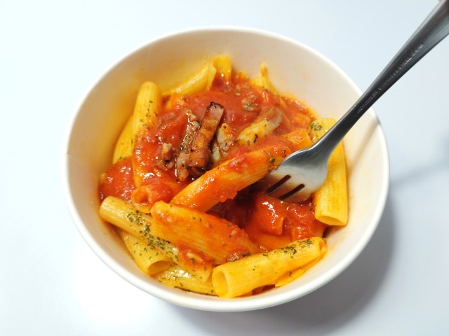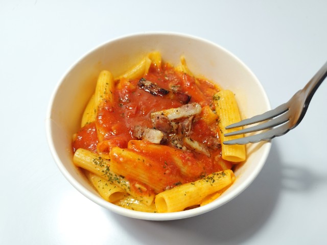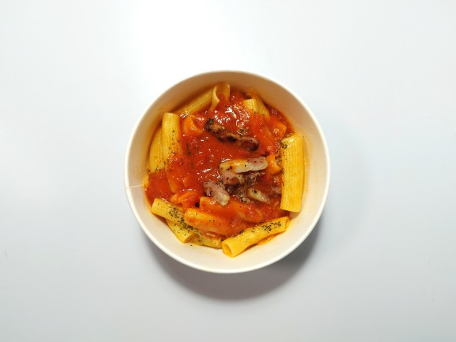 ショートパスタのリガトーニを使ったアラビアータです。以前の購入が2024年11月13日発売なので約1年近く経っていますが、価格は変わっていません。そんなアラビアータですが、ソースはトマトの酸味とにんにくの風味、唐辛子のピリッとした辛味があって、クセになる美味しさです。リガトーニはもちもちとした食感と小麦の風味があって、ソースもよく絡みます。今回はそのまま食べましたが、追い粉チーズやタバスコを加えて、味変しながら食べても美味しいと思います。内容量は1食分にちょうどよく、お腹も満たされます。ぜひリガトーニアラビアータを食べてみて下さい。
