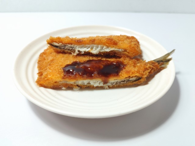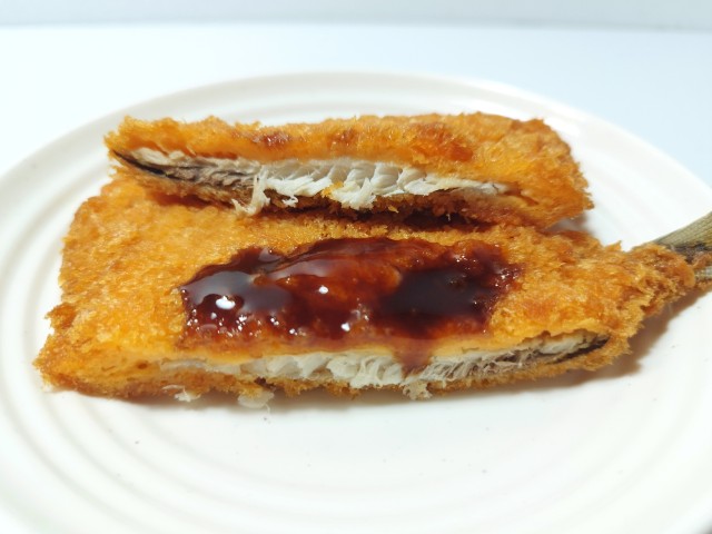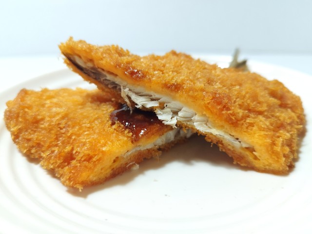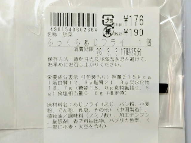 ふっくらとしたあじフライです。以前の購入が2024年12月3日だったので、1年以上経っていますが、価格が181円(税込)から190円(税込)に変わっています。ほぼ通年販売の商品なので、店頭で見かけたり、食べた事がある方も多いと思います。そんなあじフライですが、衣はサクッと身はふっくらとしていて、肉厚でサイズもあるので食べ応え抜群です。今回はソースをかけて食べましたが、醤油やタルタルソースでも美味しいと思います。また骨を取り除いてくれているのだと思いますが、食べていてもほとんど骨がないので食べやすく、魚の臭みも全く感じないので、最後のひと口まで美味しく食べられます。大きさは一人分にちょうどよく、ご飯のおかずやおつまみにオススメです。ぜひふっくらあじフライを食べてください。