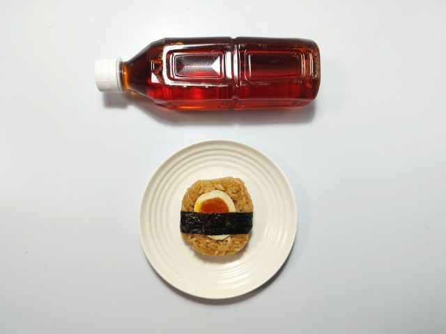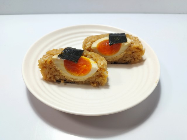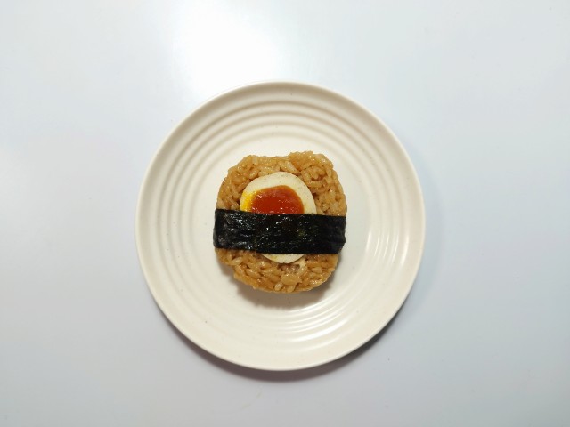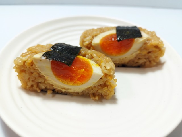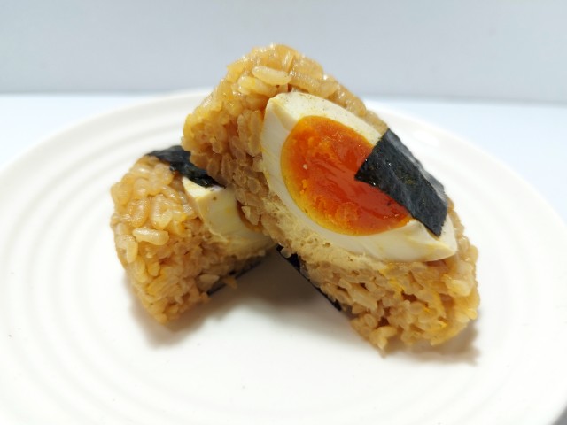 豚骨醤油味の御飯に、半熟の煮玉子を組合せたおむすびです。