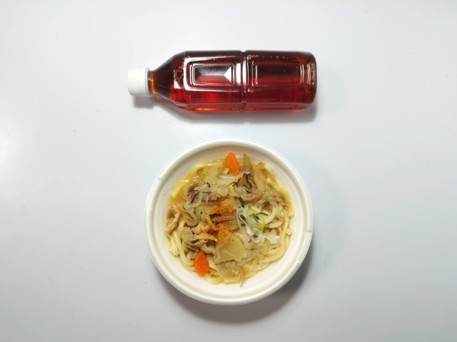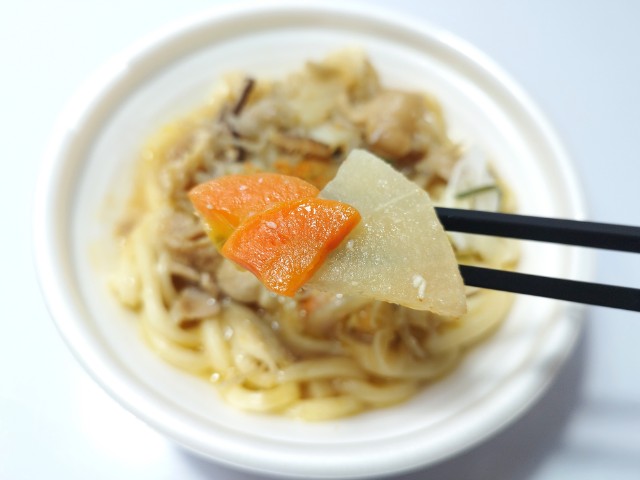 豚汁うどんです。以前の購入が2025年1月15日発売だったので、1年以上経っていますが、価格は変わっていません。そんな豚汁うどんですが、つゆは豚の旨味と野菜の甘み、味噌のコクがあって、間違いのない美味しさです。うどんはもちっとした食感と小麦の風味で、つゆともよく合います。具材には豚肉、大根、人参、ごぼう、こんにゃくなど色々と入っているので、最後のひと口まで飽きることなく食べられます。内容量は1食分にちょうどよく、お腹も満たされます。ぜひ豚汁うどんを食べてみてください。