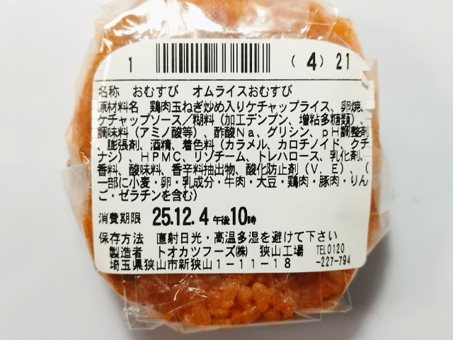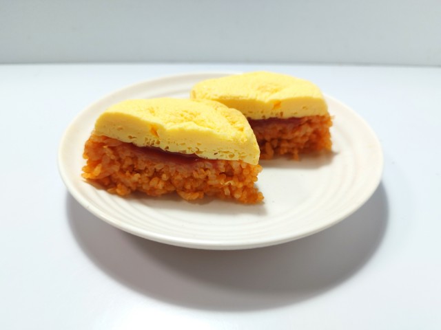 チキンライスオムレツがのったオムライスおむすびです。以前の購入が2025年8月5日発売だったので、約4ヶ月近く経っていますが、価格が276円(税込298円)から269円(税込290円)に商品名がふんわりたまごのオムライスからふんわりたまごのオムライスおむすびへと変わっています。そんなオムライスおむすびですが、チキンライス鶏の旨味バターの風味ケチャップの味わいがあって、間違いのない美味しさです。上にのったオムレツは、たまごのコクふんわりとした食感で、チキンライスともよく合います。そのままでも美味しいですが、温めて食べるとさらに美味しさが増します。大きさは普通のおむすびサイズくらいで、小腹が空いた時主食にあと一品追加したい時にピッタリです。ぜひオムライスおむすびを食べてみて下さい。