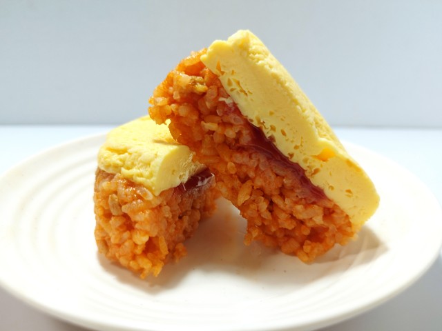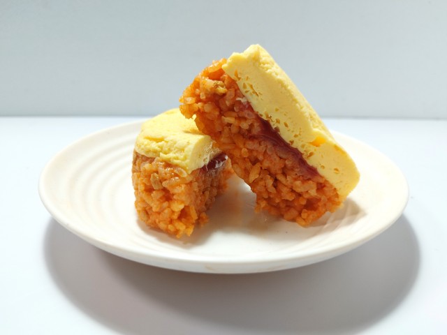 鶏肉、ケチャップ、バターなどと炒めたチキンライスと、ふんわりした食感のオムレツが相性抜群のおむすびです。