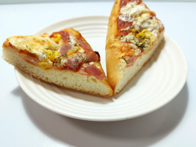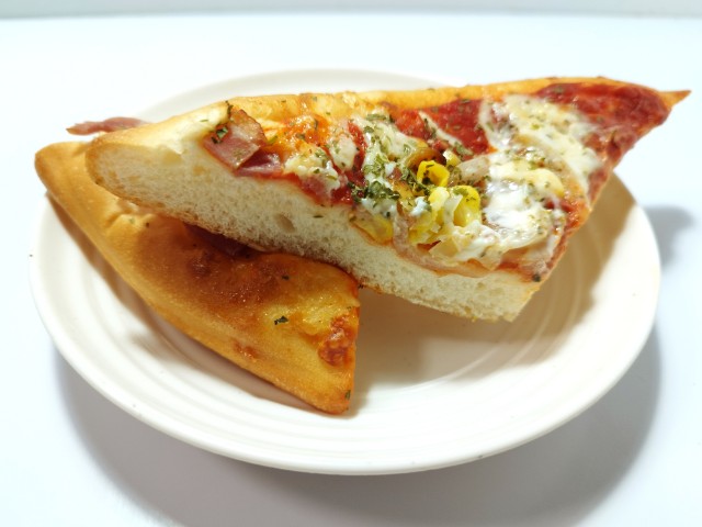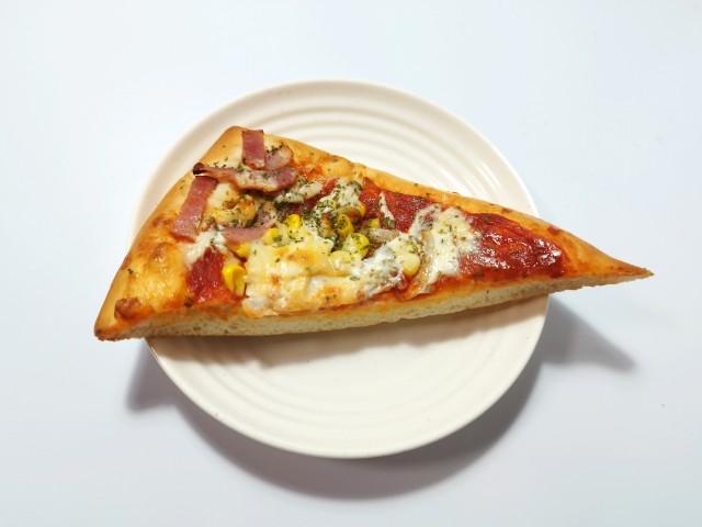 ふんわりとしたパン生地の上にトマトソース、オニオンスライス、コーン、チーズ、ベーコンをのせて焼き上げた惣菜パンです。