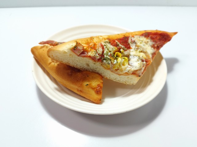 オニオンスライスやベーコン、チーズなどがのったピザパンです。以前の購入が2025年6月10日発売だったので、約半年近く経っていますが、価格は変わっていません。そんなピザパンですが、パン生地はふんわりとした食感と歯切れの良さで、安定の美味しさです。味はトマトの酸味とチーズの塩味があって、かなりピザに近い味わいになっていると思います。具材にはチーズやオニオンスライス、コーン、ベーコンなどがのっていて、味や食感を楽しめるので、最後のひと口まで美味しく食べられます。大きさは普通の惣菜パンくらいで、小腹が空いた時や主食にあと一品追加したい時にピッタリです。ぜひミックスピザパンを食べてみてください。