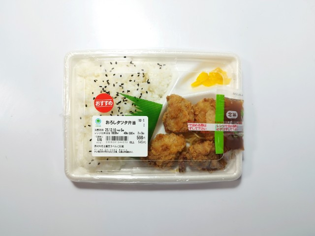 竜田揚げのお弁当です。以前の購入が2025年9月23日発売だったので、約3ヶ月近く経っていますが、価格は変わっていません。ただ商品名がおろしタツタ弁当(わかめごはん)からおろしタツタ弁当に変わっています。コンスタントに販売されている商品なので、店頭で見かけたり、食べた事がある方も多いと思います。今回、新商品ではありますが、正確にはリニューアルというのが正しいのかもしれません。そんな竜田揚げですが、柔らかくてジューシーな鶏肉で、さっぱりとしたおろしポン酢との相性は抜群です。おろしポン酢はゆずの香りとほどよい酸味で、後味がさっぱりとしています。また、今回はわかめごはんから黒ごまのかかったご飯へと変わっていて、かなりシンプルになっています。内容量は1食分にちょうどよく、お腹も満たされます。ぜひおろしタツタ弁当を食べてみて下さい。