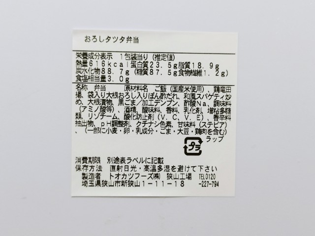 以前に購入した商品は2025年9月23日発売で商品名がおろしタツタ弁当(わかめごはん)でした↓