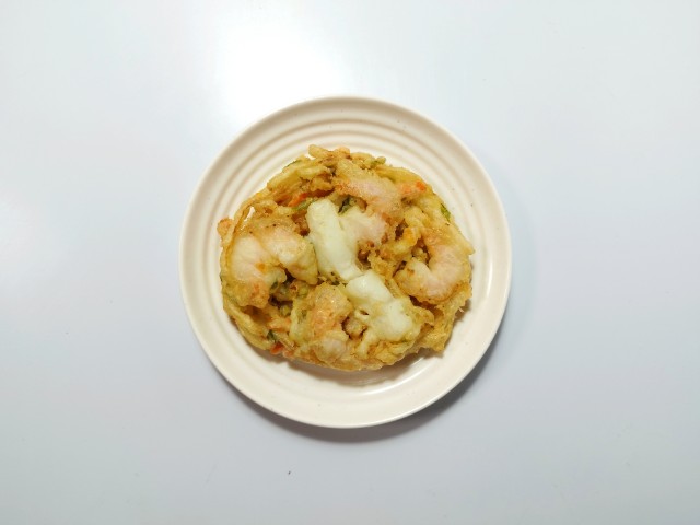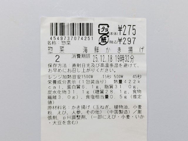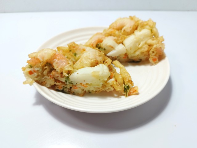 まちかど厨房の海鮮かき揚げです。以前の購入が2024年12月17日発売だったので、約1年近く経っていますが、価格は変わっていません。そんな海鮮かき揚げですが、海老やイカなど具材がはっきりとわかる程に大きくて食べ応えがあります。また、まちかど厨房ならではの店内調理なので、衣はサクサクに仕上がっていて、油もさっぱりとしています。今回は海鮮かき揚げのみを食べましたが、そのままだと当然ながら味気ないので、天つゆや塩などをかけた方が良いです。また、ご飯にのせてかき揚げ丼にしたり、そばにのせてかき揚げそばにするのもオススメです。ぜひ海鮮かき揚げを食べてみて下さい。
