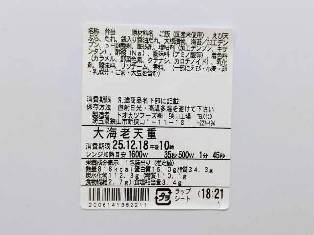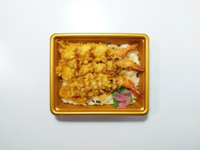 大きな海老天が3尾のった海老天重です。以前の購入が2024年12月17日発売だったので、約1年近く経っていますが、価格が739円(税込798円)から908円(税込980円)へと変わっています。正直、買うのをためらってしまうくらいの価格に変わっていましたが、紹介して皆さんに判断してもらうのも大事なので、今回は買ってみました。そんな大海老天重ですが、海老天は箸持ち上げるのも大変なくらいの大きさで、海老のプリっとした食感とほのかな甘味、天タレの味わいがあって、ご飯が進む一品になっています。衣だけが厚くて海老の身が少ない天ぷらもあったりしますが、これはしっかりとした海老が入っています。別添の醤油だれはだしの旨味とごま油の風味があって、海老天だけでなく、ご飯にもよく合います。内容量は1食分にちょうどよく、お腹も満たされます。ぜひ大海老天重を食べてみて下さい。