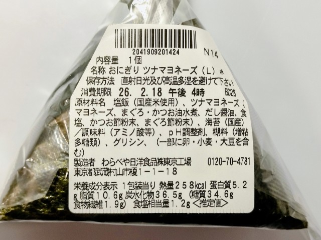 ツナマヨネーズを使った手巻おにぎりです。以前の購入が2025年9月2日発売だったので、約5ヶ月以上経っていますが、価格が165円(税込178.20円)から182円(税込196.56円)に変わっています。ほぼ通年販売の商品なので、店頭で見かけたり、食べた事がある方も多いと思います。今回、新商品ではありますが、正確にはリニューアルというのが正しいのかもしれません。そんな手巻おにぎりですが、ツナマヨネーズツナの旨味マヨネーズのなめらかな味わいで、間違いのない美味しさです。また具材の量が多いので、ご飯だけが残る心配もありません。ご飯ふっくらに仕上がっていて、パリッとした海苔とのバランスも良いです。大きさは普通のおにぎりサイズで、朝食主食にあと一品追加したい時にピッタリです。ぜひツナマヨネーズ手巻おにぎりを食べてみてください。