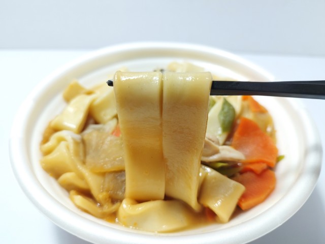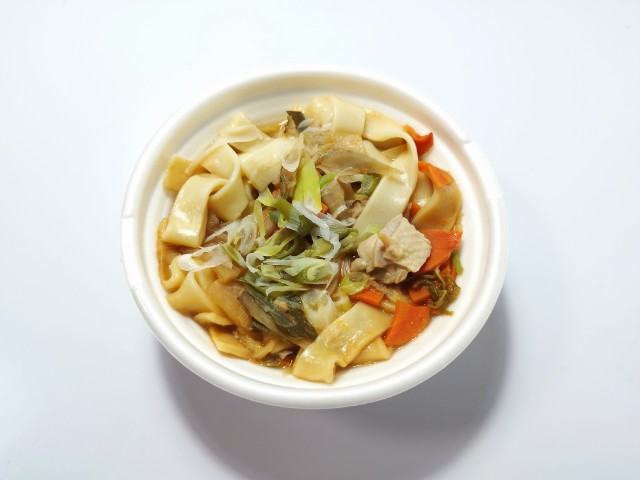 たっぷりの野菜が入った醤油仕立てのほうとうです。以前の購入が2025年10月30日発売なので約1年近く経っていますが、価格は変わっていません。そんな武州煮ぼうとうですが、これは埼玉県深谷市の郷土料理らしいです。ほうとうと言うと山梨の甲州ほうとうも有名ですが、そちらは味噌仕立てになっているそうです。と話がズレましたが、つゆは醤油の風味と野菜の旨味、やさしい甘味があって、飲み干してしまいたくなる美味しさです。幅広の麺はモチモチとした食感と小麦の風味で、つゆとのバランスも良いです。具材には大根や人参、白菜、ごぼうなどクタクタになるくらいまで煮込まれた野菜がたっぷりと使われていて、食べ応えもしっかりとあります。内容量は1食分にちょうどよく、お腹も満たされます。ぜひ武州煮ぼうとうを食べてみて下さい。