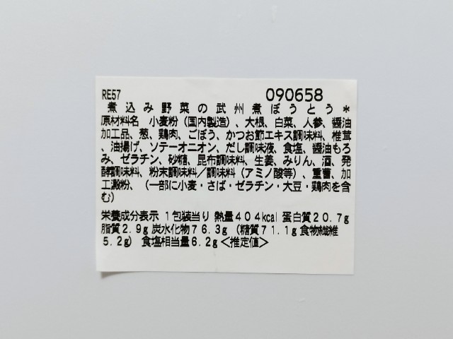 熱量:404kcal、たんぱく質:20.7g、脂質:2.9g、炭水化物:76.3g(糖質:71.1g、食物繊維:5.2g)、食塩相当量:6.2g