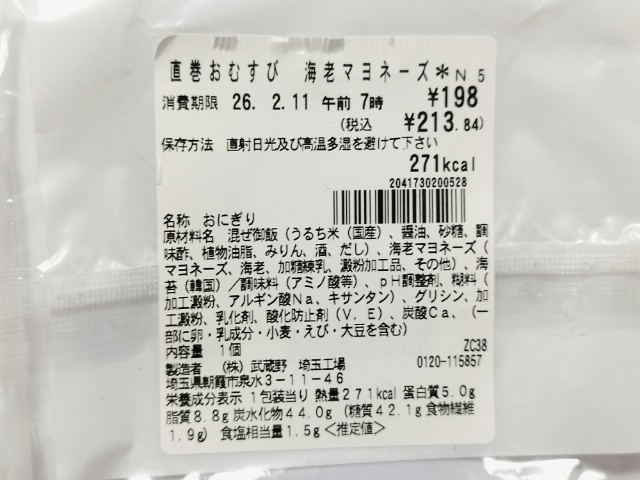 海老マヨネーズを使ったおむすびです。以前の購入が2025年4月15日発売だったので、約10ヶ月近く経っていますが、価格が178円(税込192.24円)から198円(税込213.84円)へと変わっています。そんなおむすびですが、ご飯はだしの旨味と醤油の風味を楽しめる混ぜ飯で、これだけでも美味しく食べ進められます。海老マヨネーズは海老の旨味とプリッとした食感、マヨネーズのなめらかな味わいがあって、美味しいのひと言です。大きさは普通のおむすびサイズで、小腹が空いた時や主食にあと一品追加したい時にピッタリです。ぜひ海老マヨネーズの直巻おむすびを食べてみてください。