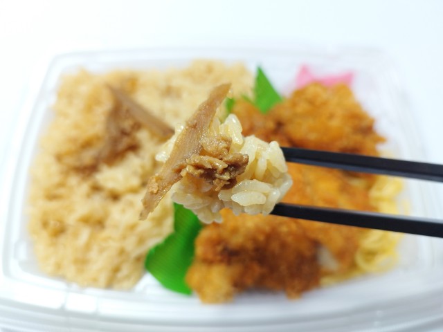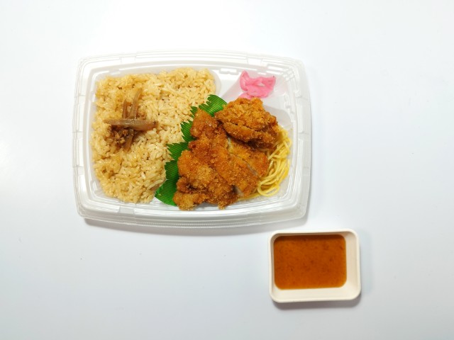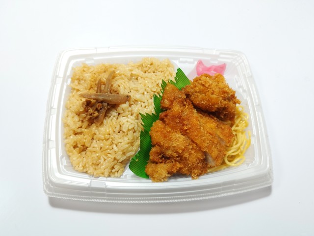 鶏の旨みが感じられる鶏めしにチキンカツを組み合わせたお弁当です。チキンカツは鶏もも肉を塩こうじなどに漬け込んだジューシーな仕立てです。
