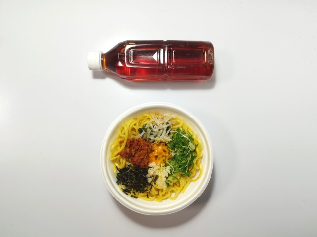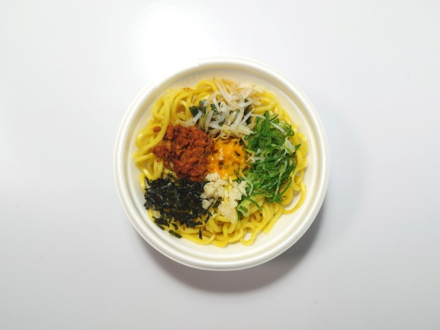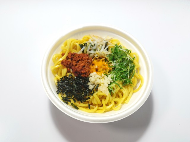 弾力ある太めの中華麺に、魚節と唐辛子の旨み・辛さが特徴の専用ダレを合わせ、台湾風肉そぼろ・もやし・刻みのりなどをのせた麺屋こころ監修の台湾風まぜそばです。別添の「昆布酢」を加えることで味の変化も楽しめます。