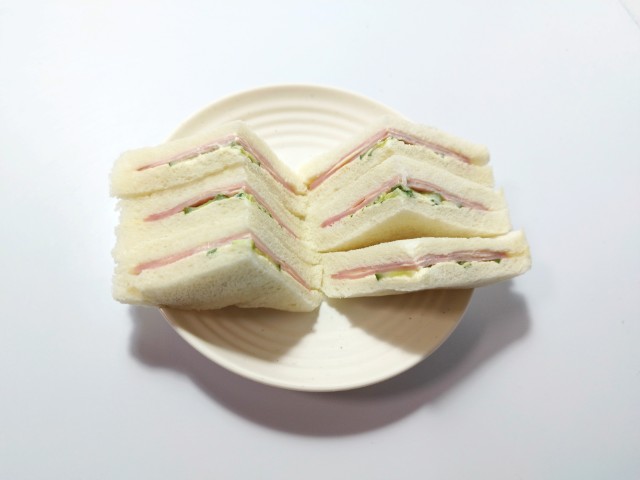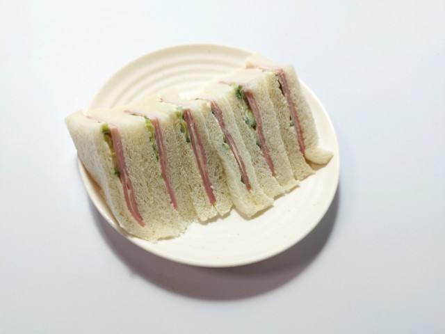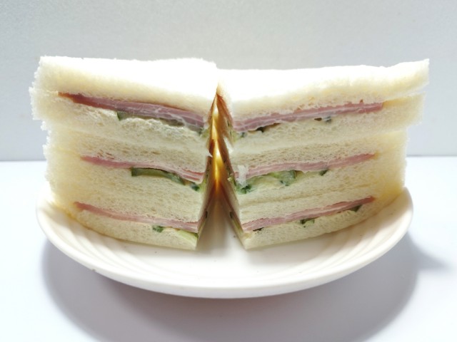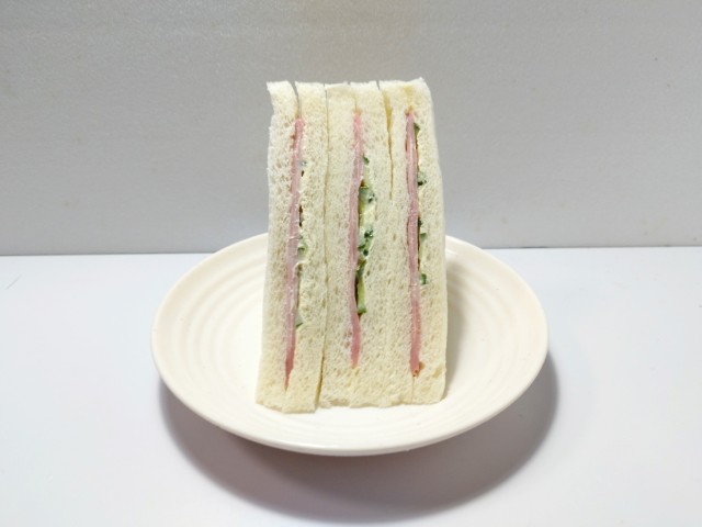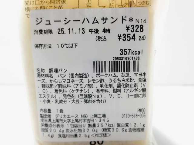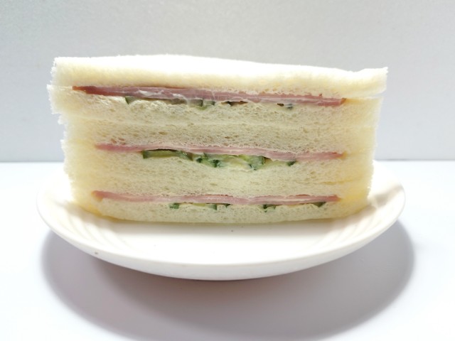 ハムを挟んだサンドイッチです。以前の購入が2025年7月16日発売なので約4ヶ月近く経っていますが、価格が300円(税込324円)から328円(税込354.24円)に商品名がジューシーハムサンドからしマヨネーズ入りからジューシーハムサンドへと変わっています。ほぼ通年販売の商品なので、店頭で見かけたり、食べた事がある方も多いと思います。今回、新商品ではありますが、正確にはリニューアルというのが正しいのかもしれません。そんなハムサンドですが、ハムはハムの塩味としっとりとした食感で、間違いのない美味しさです。ハムと一緒に挟まっているきゅうりが食感のアクセントになっていて、さらに美味しく食べ進められます。ポイントはからしマヨネーズで、ピリッとした辛味とほのかな酸味がハムによく合います。大きさは普通のサンドイッチサイズで、朝食や小腹が空いた時にピッタリです。ぜひジューシーハムサンドを食べてみて下さい。