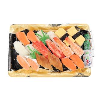 銀鮭とトラウトサーモン、トロサーモン、穴子、カレイ、カニカマ、玉子を2貫ずつ盛り合わせたにぎり寿司のセットです。期間限定で増量しました。