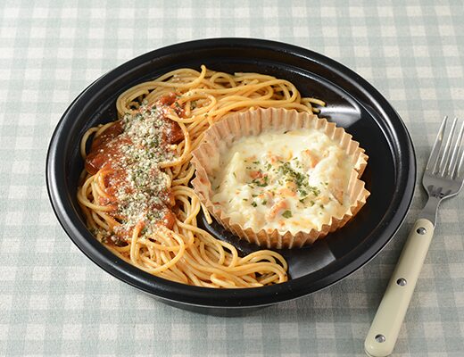 肉の旨みが効いたミートソースと、鶏モモ肉を入れたクリーミーなマカロニグラタンのセット。