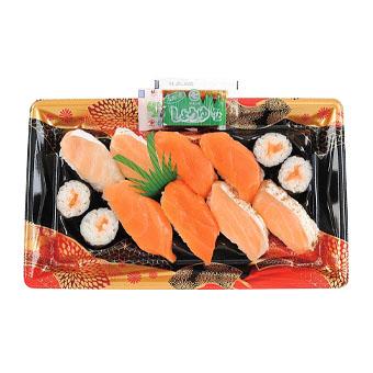 銀鮭にぎり4貫ととろサーモンにぎり2貫、焼サーモンにぎり2貫、サーモン細巻4巻を盛り合わせた商品です。