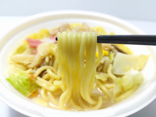 色々な具材がのったちゃんぽんです。以前の購入が2025年1月7日発売だったので、約11ヶ月近く経っていますが、価格が510円(税込550円)から554円(税込598円)に商品名がコク旨 ちゃんぽんから海老と野菜のコク旨ちゃんぽんへと変わっています。そんな海老と野菜のコク旨ちゃんぽんですが、丸麺はツルっとした食感とのどごしが良さで、箸がどんどんと進みます。ちゃんぽんスープは豚の旨味と野菜の風味、なめらかな味わいがあって、麺との相性抜群です。具材には海老やかまぼこ、キャベツ、人参、玉ねぎ、コーンなど色々とのっているので、最後のひと口まで飽きることなく食べられます。内容量は1食分にちょうどよく、お腹も満たされます。ぜひ海老と野菜のコク旨ちゃんぽんを食べてみて下さい。