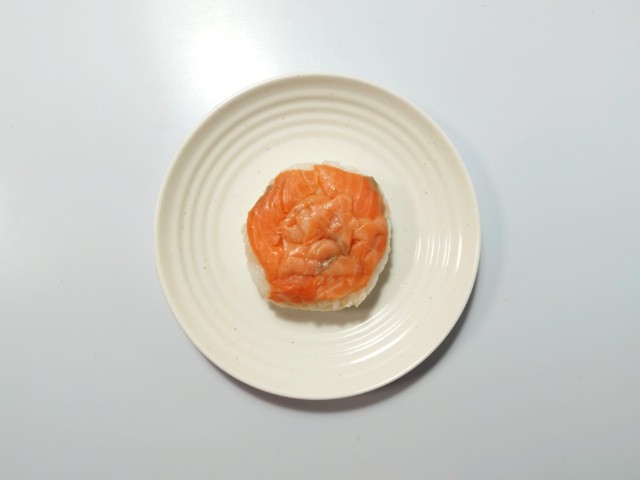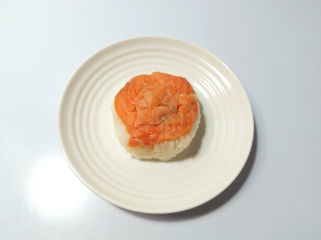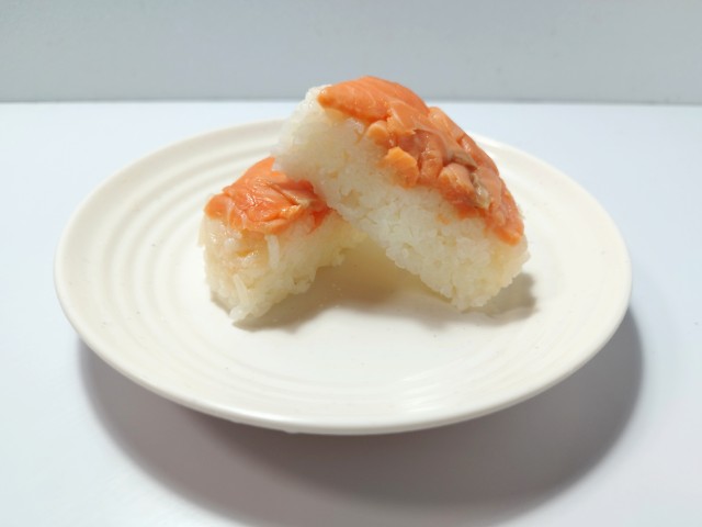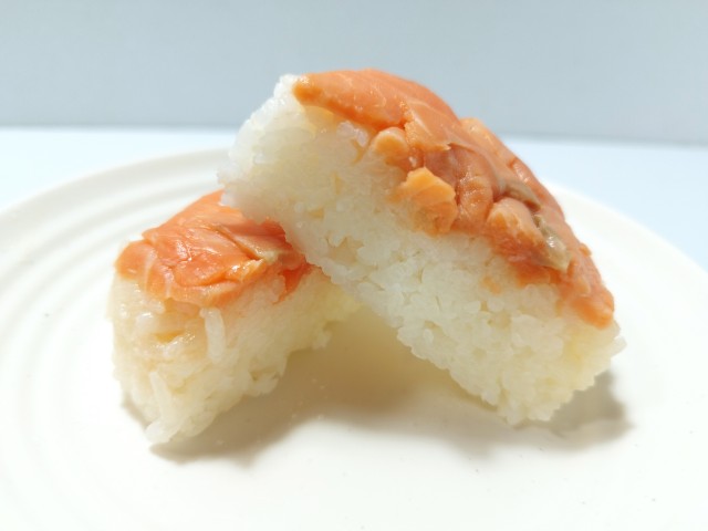 サーモンのお寿司です。以前の購入が2025年9月2日発売だったので、約5ヶ月以上経っていますが、価格が238円(税込257.04円)から275円(税込297円)へと変わっています。コンスタントに販売されている商品なので、店頭で見かけたり、食べた事がある方も多いと思います。今回、新商品ではありますが、正確にはリニューアルというのが正しいのかもしれません。また、今回は価格もそうですが、形状も四角から丸へと変わっています。ちなみにほとんどの地域の方は同名のサーモンの寿司(2026年2月10日発売)の丸型だと思いますが、前文にもあるように以前は形の違いで、区分けされていましたが、今回はそれも無くなって、栄養成分のみでの違いとなっています。そんなサーモンの寿司ですが、サーモンはしっとりと柔らかく、サーモンの旨味がしっかりと詰まっていて、酢飯との相性も抜群です。酢飯はほどよい酸味とさっぱりとした後味で、安定の美味しさです。このままでも十分美味しいですが、わさびを軽く浸けると味が締まって、また違った美味しさを楽しめます。大きさは普通のおむすびサイズくらいで、小腹が空いた時や主食にあと一品追加したい時にピッタリです。ぜひサーモンの寿司を食べてみてください。