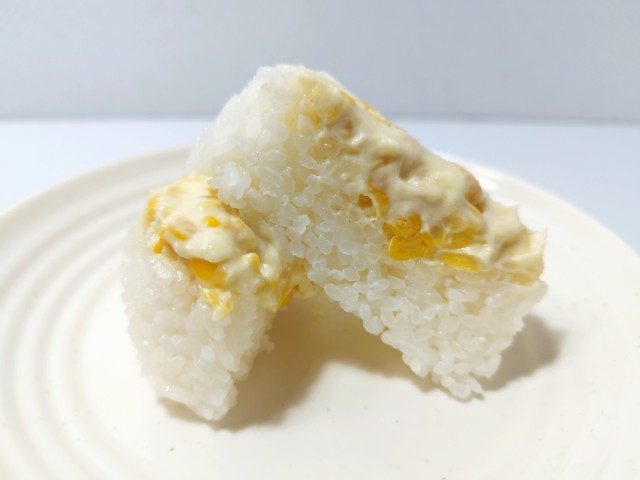 コーンマヨを使ったお寿司です。以前の購入が2024年10月15日発売だったので、1年以上経っていますが、価格が138円(税込149円)から184円(税込198円)に商品名がコーンマヨネーズ寿司からコーンマヨ寿司へと変わっています。そんなコーンマヨ寿司ですが、コーンマヨはコーンの甘味とマヨネーズの酸味があって、相性抜群の組み合わせになっています。ポイントはコーンの食感で、シャキシャキとした食感は食欲をさらにかき立ててくれます。酢飯はやさしい酸味とほろほろと崩れる食感で、コーンマヨとのバランスも良いです。大きさは普通のおむすびサイズで、小腹が空いた時や主食にあと一品追加したい時にピッタリです。コーンマヨ寿司を食べてみてください。
