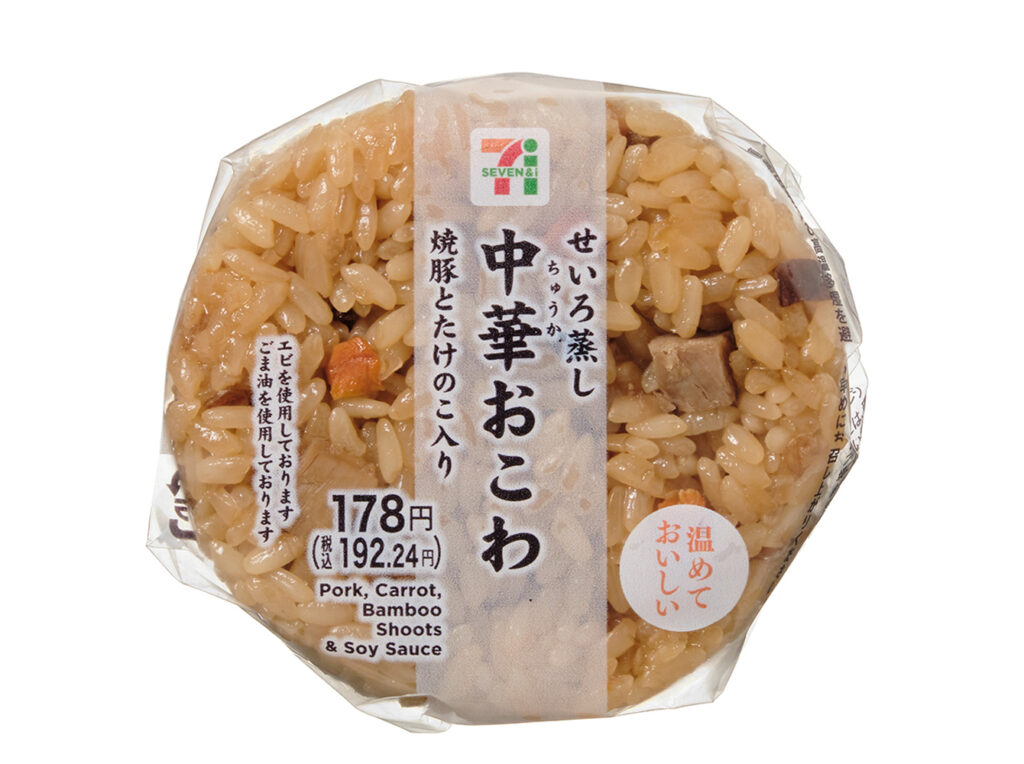 もち米をせいろで丁寧に蒸し上げた、モチモチ食感が楽しめるおこわおむすびです。人参やたけのこ,焼豚などを混ぜ、醤油やオイスターソースで味付けしました。