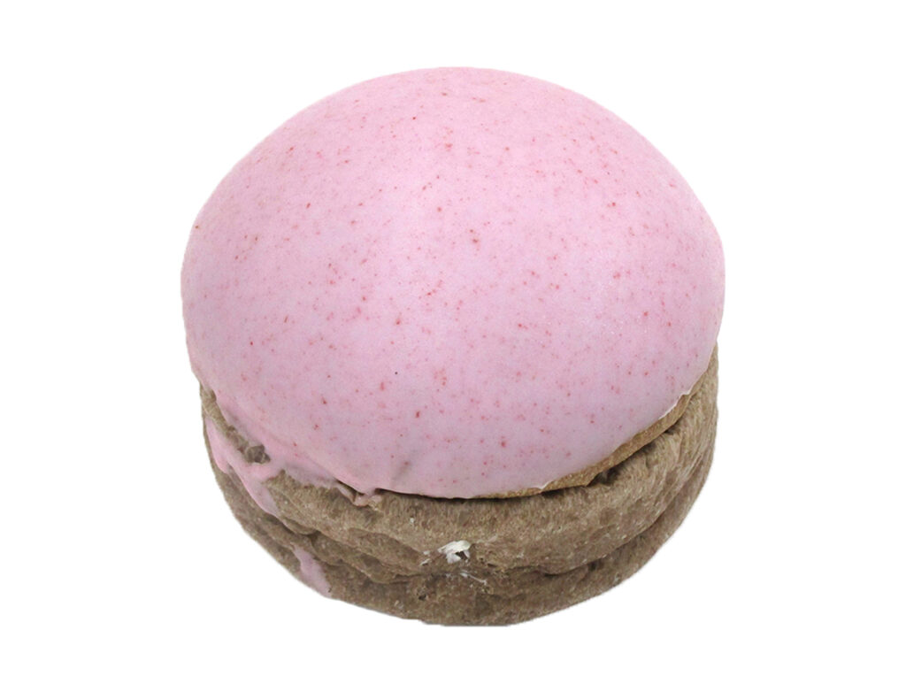 ココアを練り込んだふんわり生地に甘酸っぱいいちごホイップを絞り、イチゴコーチングを掛けた菓子パンです。