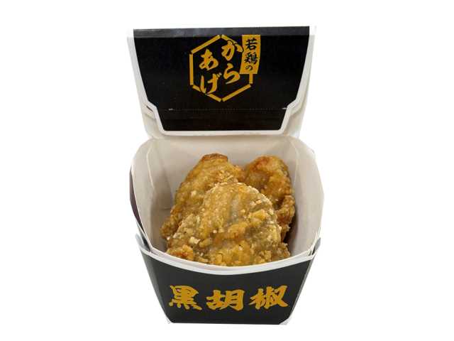 ジューシーなもも肉のからあげをパンチの効いた黒胡椒味に仕上げました。黒胡椒のキレで何個でも食べたくなる味付けです。