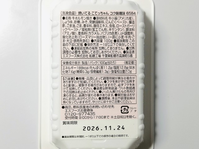 こてっちゃんのコク味噌味です。以前の購入が2023年5月16日だったので、2年以上経っていますが、価格が313円(税込338円)から328円(税込354円)に商品名が焼いてる!こてっちゃんコク味噌味から焼いてる!こてっちゃんへと変わっています。そんなこてっちゃんですが、牛ホルモンはほどよい弾力と溢れる脂で、ハマってしまう美味しさです。ポイントはやはり味付けで、味噌のコクとごま油の風味、にんにくの味わいで、牛ホルモンの美味しさがさらに引き立っています。ホルモンの独特の臭みも全くないので、最後のひと口まで美味しく食べられます。内容量は一人分にちょうどよく、おつまみやご飯のおかずにオススメです。ぜひ焼いてる!こてっちゃんを食べてみて下さい。