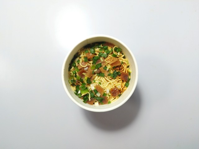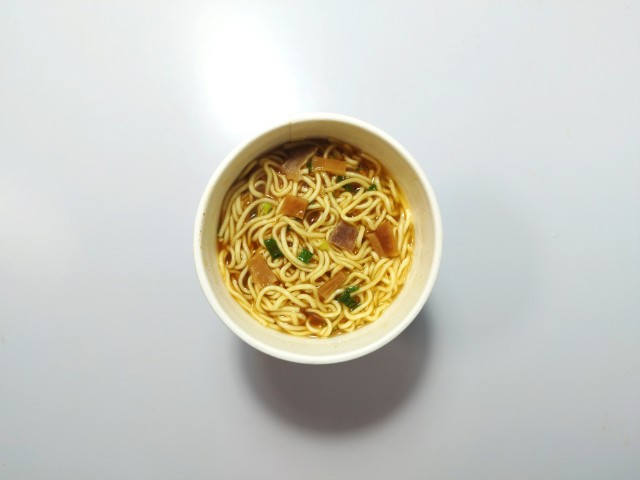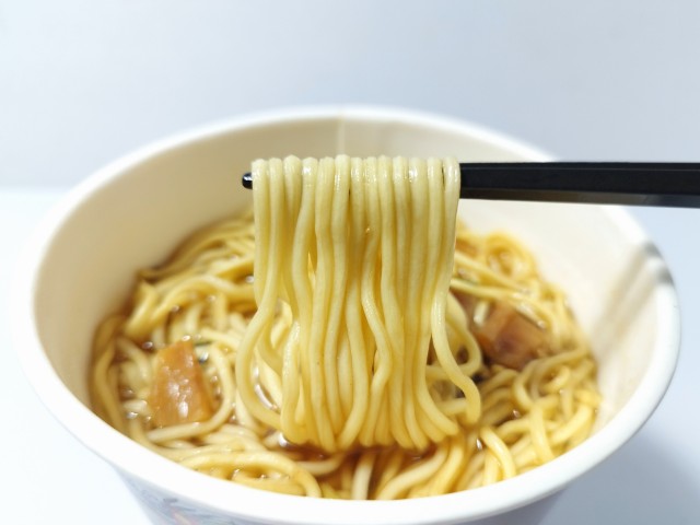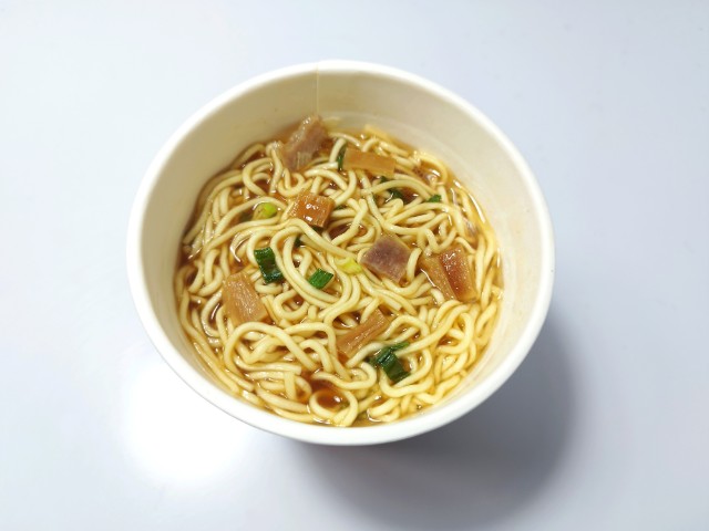 来来亭監修の背脂しょうゆラーメンです。以前の購入が2024年12月27日だったので、1年以上経っていますが、価格が258円(税込278円)から267円(税込288円)へと変わっています。ほぼ通年販売の商品なので、店頭で見かけたり、食べた事がある方も多いと思います。今回、新商品ではありますが、正確にはリニューアルというのが正しいのかもしれません。そんな背脂しょうゆラーメンですが、スープは豚の旨味と醤油の味わい、にんにくの風味があって、美味しいのひと言です。麺は細めのストレート麺で、小麦の風味と歯切れの良さがあって、背脂醤油スープとの相性抜群です。具材には焼豚やメンマ、ねぎが入っていて、それぞれの味や食感を楽しめます。内容量は1食分にちょうどよく、お腹も満たされます。ぜひ背脂しょうゆラーメンを食べてみてください。