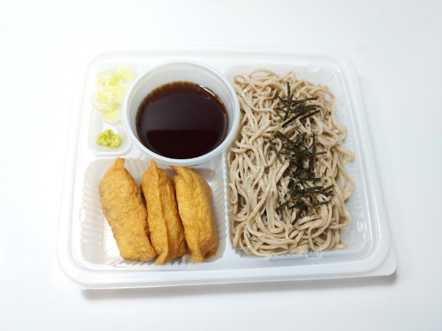 歯切れよく風味豊かなそばに、だしのきいたつゆを合わせたざるそばと、甘辛い味つけのお揚げを使ったいなり寿司を盛り合わせた食べごたえのある商品です。※宮崎県、鹿児島県では取り扱いがございません。