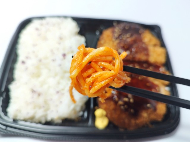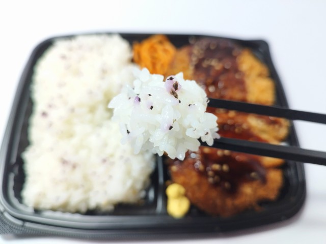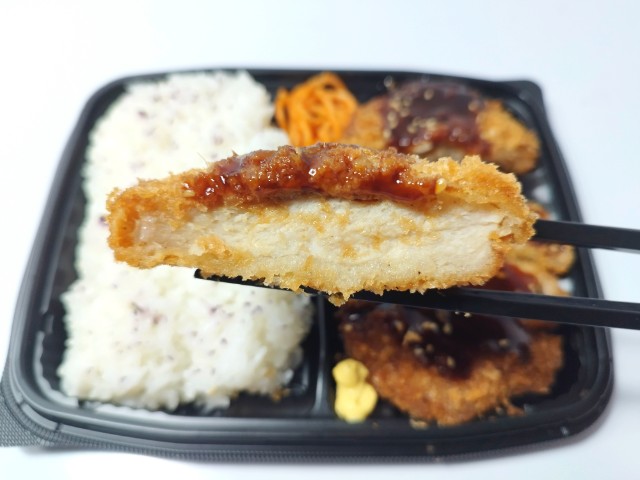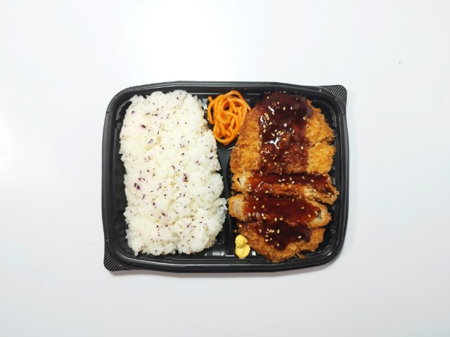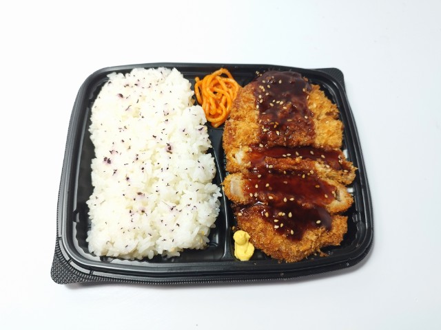 豚ロース肉のとんかつ弁当です。以前の購入が2025年2月10日発売だったので、約1年近く経っていますが、価格が650円(税込702円)から698円(税込753.84円)へと変わっています。そんなとんかつ弁当ですが、肉厚なロースとんかつはしっとり柔らかい肉質とジューシーな味わいで、食べ応え抜群です。ソースはフルーティーな甘味とやさしい酸味で、とんかつにもよく合います。味変としてからしをつけて食べたり、別で用意するようですが、胡麻をふったり、マヨネーズをつけて食べても美味しいと思います。内容量は1食分にちょうどよく、お腹も満たされます。ぜひロースとんかつ弁当を食べてみてください。