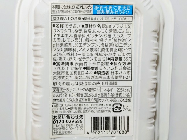 熱量:225kcal、たんぱく質:8.8g、脂質:20.6g、炭水化物:1.4g(糖質:0.9g、食物繊維:0.5g)、食塩相当量:0.9g