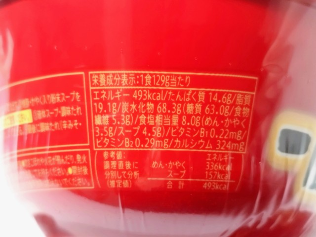 熱量:493kcal、たんぱく質:14.6g、脂質:19.1g、炭水化物:68.3g(糖質:63.0g、食物繊維:5.3g)、食塩相当量:8g