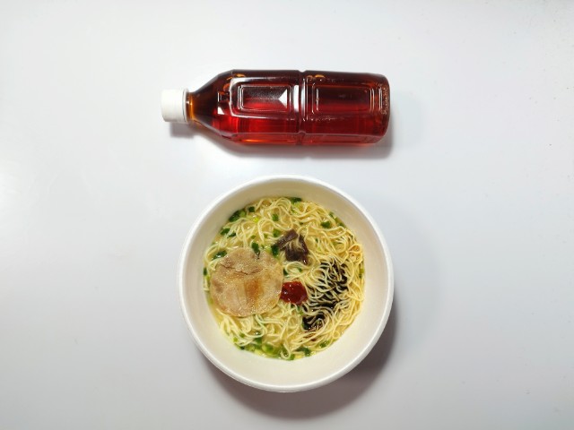 液体スープを入れてかき混ぜて、黒香油と辛みそを添えたら完成です。