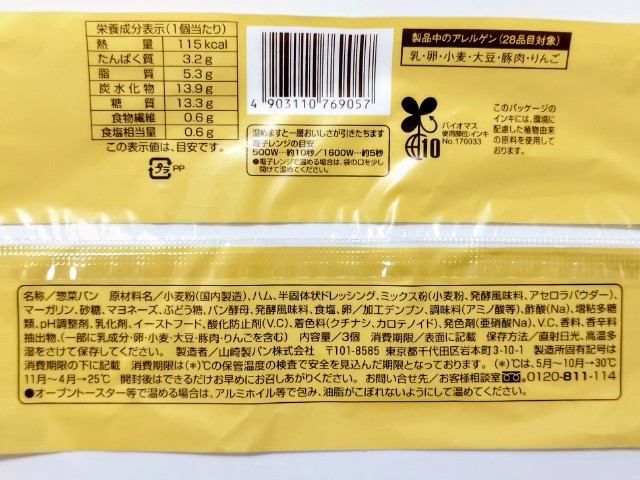 ハムとマヨ風味ドレッシングを巻き込み、上からマヨネーズをトッピングして焼きあげた惣菜パン3個入りです。