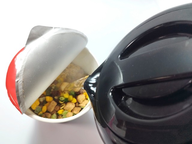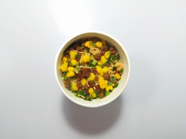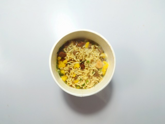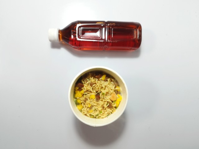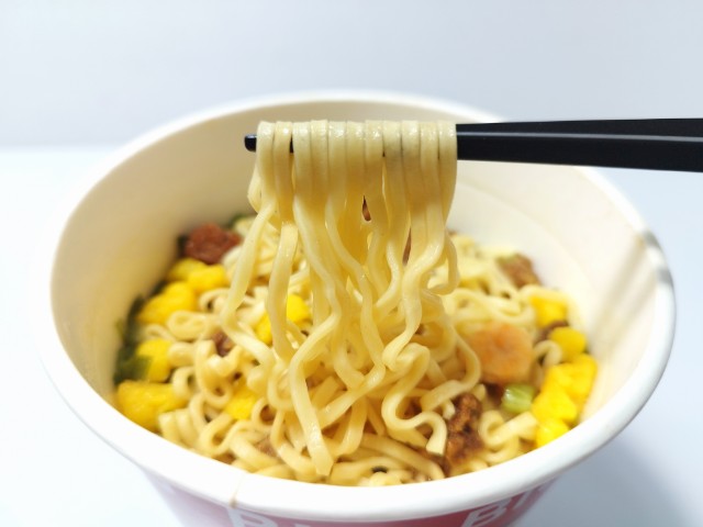 ポークとチキンのうま味に、ガーリック、こしょうで程よくスパイシーに仕上げた醤油味のカップラーメンです。