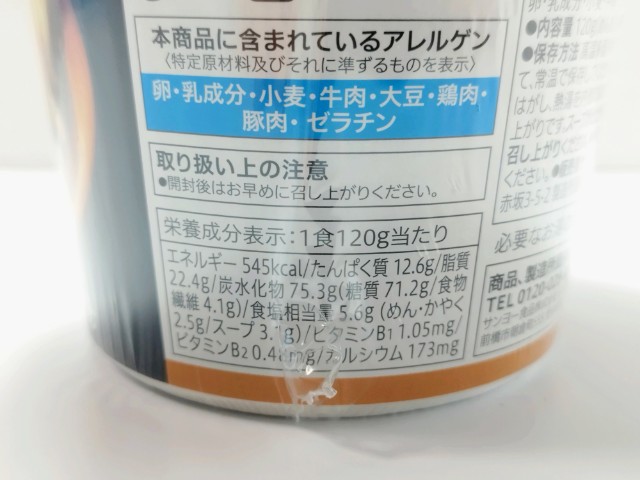 熱量:545kcal、たんぱく質:12.6g、脂質:22.4g、炭水化物:75.3g(糖質:71.2g、食物繊維:4.1g)、食塩相当量:5.6g