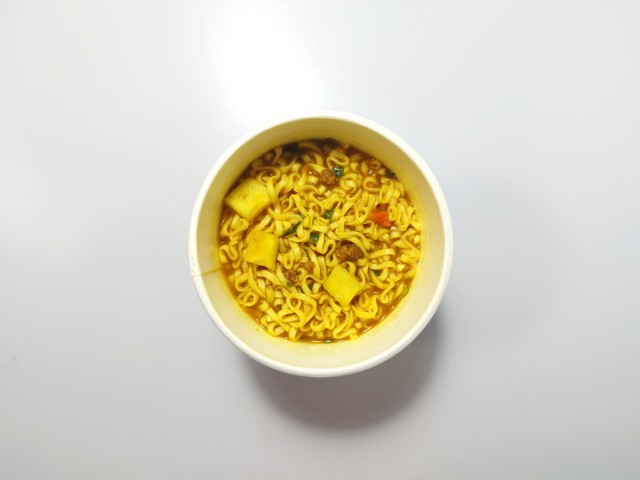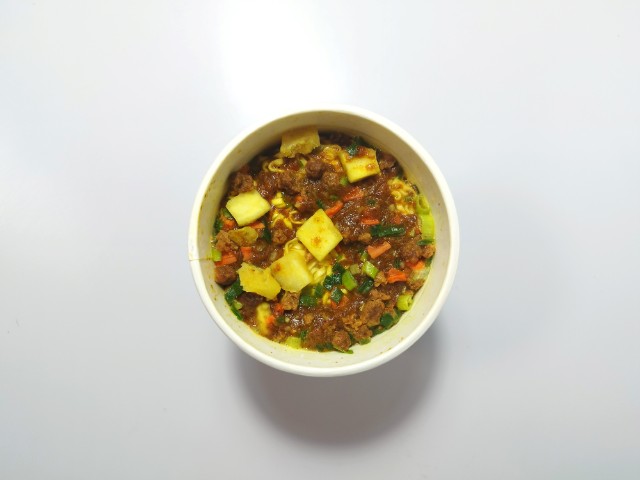 BIGサイズのカレーヌードルです。以前の購入が2024年8月12日だったので、1年以上経っていますが、価格は変わっていません。ほぼ通年販売の商品なので、店頭で見かけたり、食べた事がある方も多いと思います。今回、新商品ではありますが、正確にはリニューアルというのが正しいのかもしれません。ちなみにパッケージと栄養成分が若干変わっています。そんなカレーヌードルBIGですが、スープは牛の旨味と豚のコク、スパイスの風味があって、間違いのない美味しさです。麺は歯切れの良さと小麦の風味で、カレースープとのバランスも良いです。具材には味付肉そぼろやフライドポテト、人参、玉ねぎなど色々と入っているので、最後のひと口まで飽きることなく食べられます。内容量は1食分にちょうどよく、お腹も満たされます。ぜひカレーヌードルBIGを食べてみて下さい。