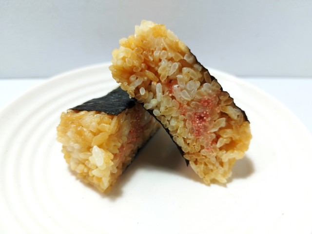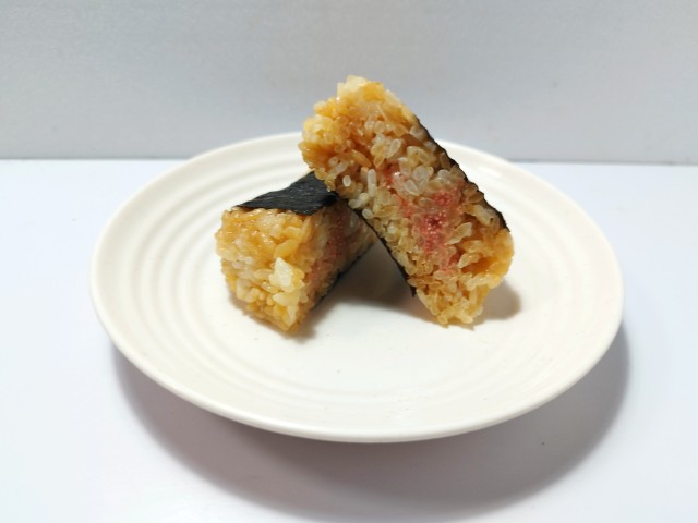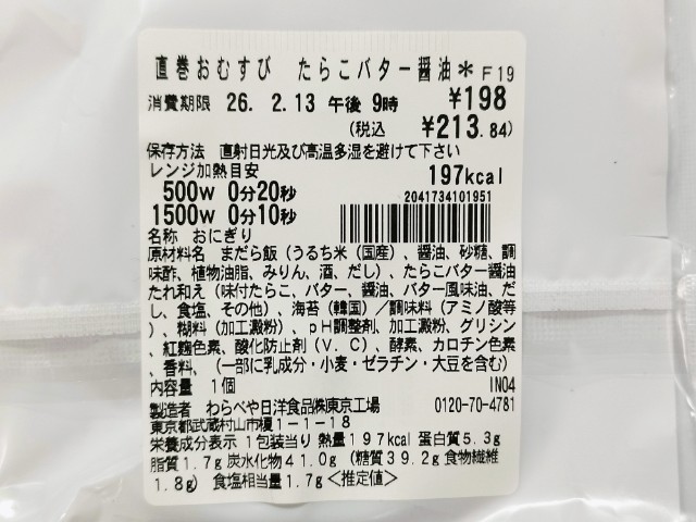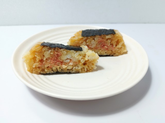 たらこバター醤油を使ったおむすびです。以前の購入が2025年6月3日発売だったので、約8ヶ月近く経っていますが、価格が178円(税込192.24円)から198円(税込213.84円)へと変わっています。そんなおむすびですが、ご飯はだしの旨味と醤油の風味を楽しめるまだら飯で、これだけでも美味しく食べ進められます。具材のたらこバター醤油はたらこの味わいとバターの風味、醤油の塩味があって、ご飯との相性抜群です。そのままでも美味しいですが、温める事でバターの風味がアップするので、余裕があれば温める事をオススメします。大きさは普通のおむすびサイズで、小腹が空いた時や主食にあと一品追加したい時にピッタリです。ぜひたらこバター醤油のおむすびを食べてみてください。