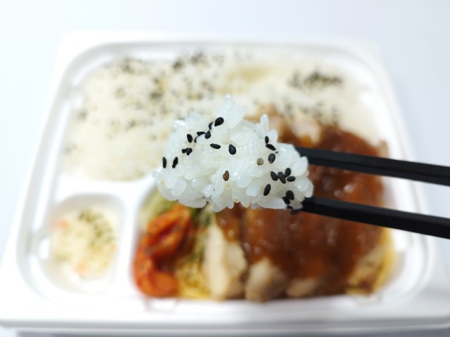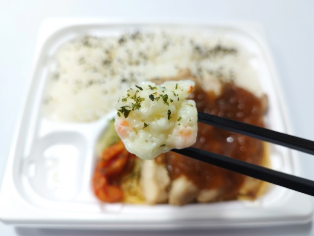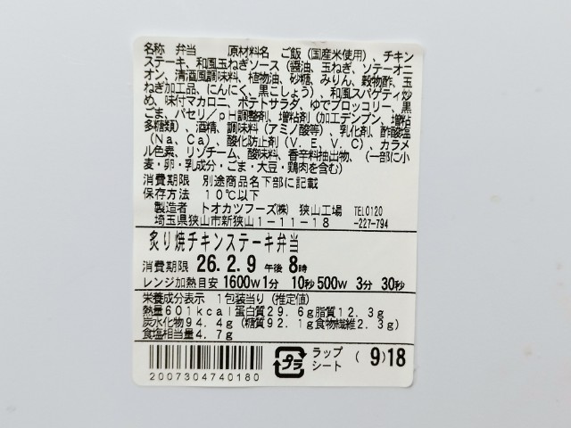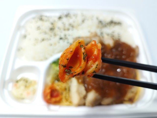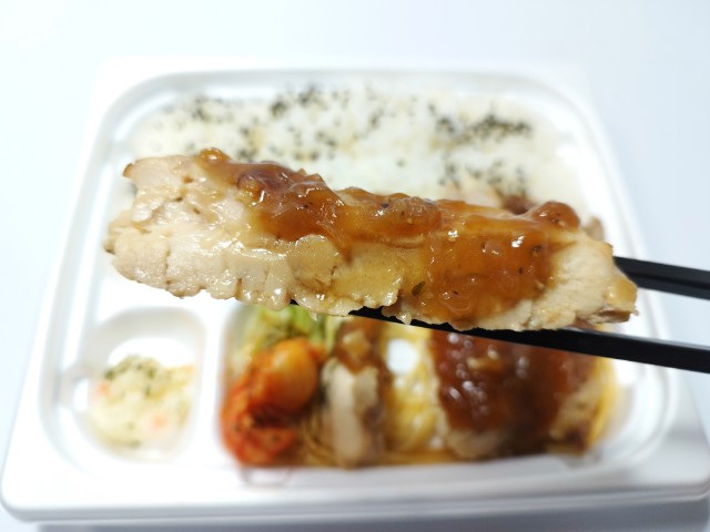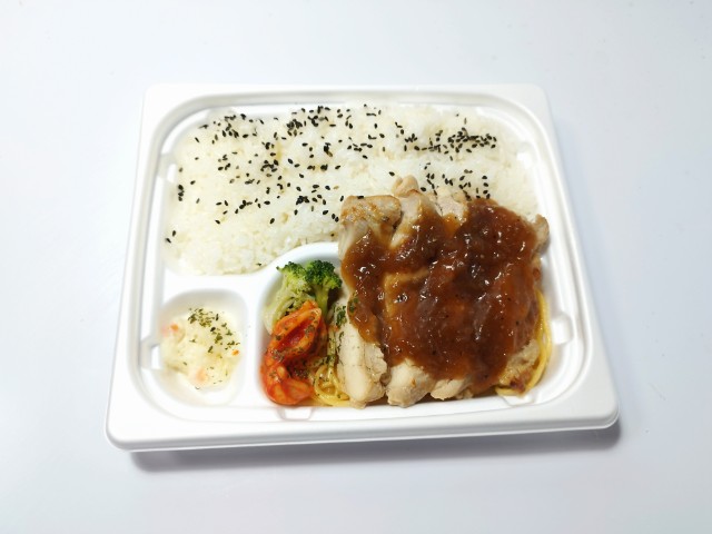 チキンステーキのお弁当です。以前の購入が2025年2月25日発売だったので、約1年近く経っていますが、価格が599円(税込646円)から647円(税込698円)へと変わっています。そんなチキンステーキは、鶏の旨味としっとりと柔らかい肉質で、間違いのない美味しさです。特製ソースは、玉ねぎの甘味と醤油の風味、にんにくの香りがあって、チキンステーキとの相性抜群です。他にも和風スパゲティや味付マカロニ、ポテトサラダなどがのっているので、最後のひと口まで飽きることなく食べられます。内容量は1食分にちょうどよく、お腹も満たされます。ぜひ二段仕込みの炙り焼チキンステーキ弁当を食べてみてください。