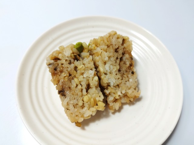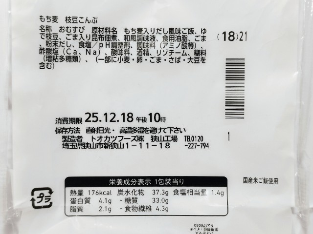 枝豆昆布を使ったおむすびです。以前の購入が2025年1月21日発売だったので、約11ヶ月近く経っていますが、価格が156円(税込168円)から176円(税込190円)に商品名がもち麦 枝豆こんぶおむすびからもち麦入り 枝豆こんぶへと変わっています。そんなもち麦が入ったご飯だしの旨味もちもちとした食感で、食べ応えがあります。また、具材として枝豆昆布が混ぜ込んであって、昆布の塩味枝豆の食感を楽しむ事が出来ます。全体的に普通のおむすびとはちょっと食感が違いますが、しっかりと噛んで食べるような感覚おむすびなので、味わいを楽しめて満腹度も高めです。大きさは普通のおむすびサイズで、朝食小腹が空いた時にピッタリです。ぜひ枝豆こんぶおむすびを食べてみてください。