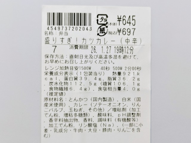盛りすぎ!カツカレーです。以前の購入が2025年11月25日発売だったので、約2ヶ月近く経っていますが、価格は変わっていません。ローソンでは1月27日より「盛りすぎチャレンジ」を開催していて、今回の商品も対象商品の一つになっています。ちなみに内容としてはとんかつがお値段そのまま50%以上増量(1個増量)(従来品との比較)になっているらしいです。そんなカツカレーですが、カレーソースはスパイスの風味とほどよい辛味があって、ご飯が進む美味しさです。厚みのあるとんかつは豚の旨味としっとり柔らかい肉質で、カレーとの相性抜群です。そして、今回はそのとんかつが1個増量となっている事で、さらに食べ応えが増しています。かなりのボリュームなので、ガッツリ食べたい方にもオススメの商品です。ぜひ盛りすぎ!カツカレーを食べてみてください。