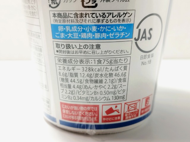 熱量:328kcal、たんぱく質:8.6g、脂質:12.4g、炭水化物:46.6g(糖質:44.5g、食物繊維:2.1g)、食塩相当量:4.4g
