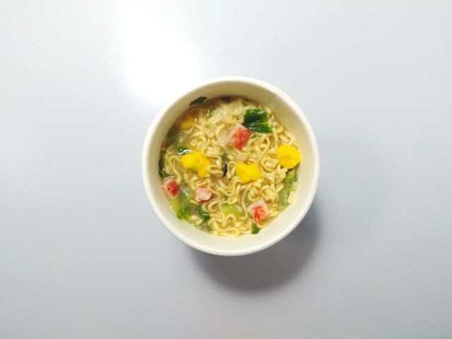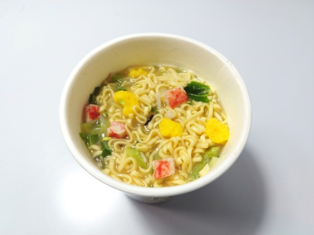 シーフードヌードルです。以前の購入が2024年9月12日だったので、1年以上経っていますが、価格は変わっていません。ほぼ通年販売の商品なので、店頭で見かけたり、食べた事がある方も多いと思います。今回、新商品ではありますが、正確にはリニューアルというのが正しいのかもしれません。ちなみにパッケージと栄養成分が若干変わっています。そんなシーフードヌードルですが、スープは豚の旨味と魚介の風味、紅生姜のほのかな酸味があって、間違いのない美味しさです。麺は歯切れの良さと小麦の風味で、スープもよく絡みます。具材にはかに風味かまぼこやイカ、キャベツ、味付卵などが入っていて、それぞれの味や食感を楽しめます。また、ちょい足しアレンジとして牛乳やチーズを入れても美味しいと思います。内容量は普通のカップ麺サイズで、小腹が空いた時やおにぎりやパンと合わせて1食分にするのにもオススメです。ぜひシーフードヌードルを食べてみて下さい。