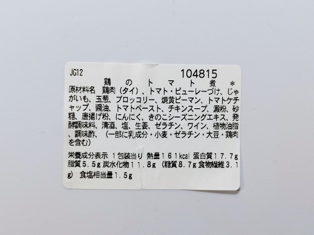 熱量:161kcal、たんぱく質:17.7g、脂質:5.5g、炭水化物:11.8g(糖質:8.7g、食物繊維:3.1g)、食塩相当量:1.5g