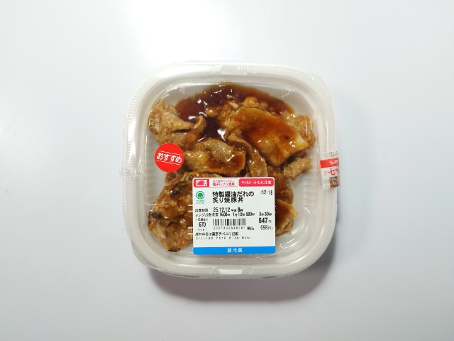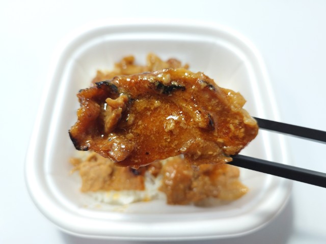 醤油だれで味付けした豚肉がのったお弁当です。以前の購入が2023年10月24日発売だったので、2年以上経っていますが、価格が554円(税込598円)から647円(税込698円)に商品名が甘辛醤油だれの炙り焼豚丼から特製醤油だれの炙り焼豚丼へと変わっています。そんな特製醤油だれの炙り焼豚丼ですが、豚肉はしっとりとした肉質の豚ロース肉とジューシーな肉質の豚バラ肉が入っていて、それぞれ違った食感を楽しめます。味付けである特製醤油だれは醤油の風味と甘辛い味わいで、豚肉との相性抜群です。今回はそのまま食べましたが、別添の七味以外にも味変で山椒を入れたり、生卵を落としても美味しいと思います。内容量は1食分にちょうどよく、お腹も満たされます。ぜひ特製醤油だれの炙り焼豚丼を食べてみてください。