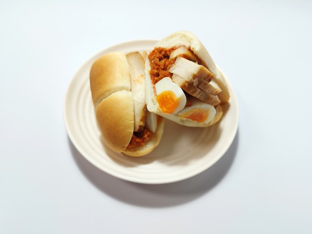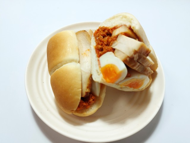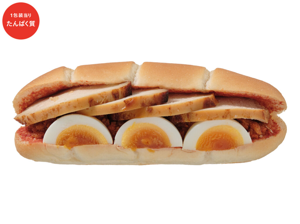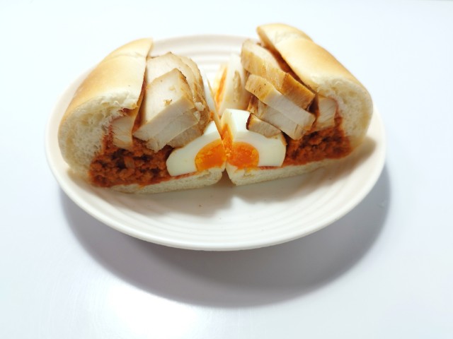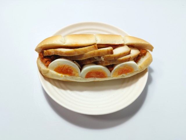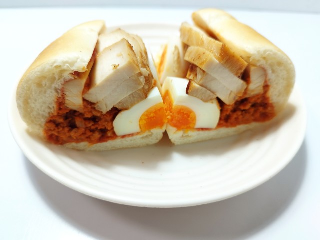 ローストチキンと半熟ゆで玉子、チリソイミートを組み合わせた食べ応えのあるロールパンです。