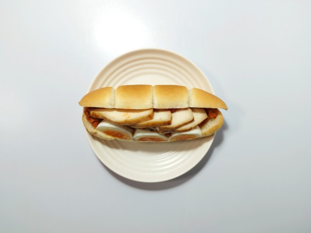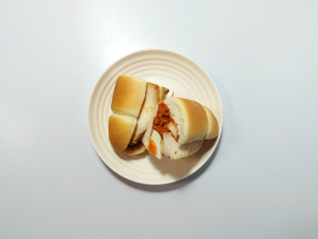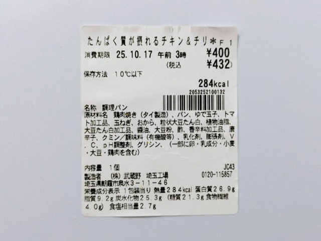 ローストチキンとチリミートを使ったロールパンです。以前の購入が2025年8月6日発売なので約2ヶ月以上経っていますが、価格は変わっていません。そんなロールパンですが、生地はしっとりとした食感と歯切れの良さで食べ応えがあります。味はチリミートの旨味とローストチキンの味わい、半熟ゆで玉子の食感で、どんどんと食べ進めてしまう美味しさです。ちなみに今回の1包装あたりのたんぱく質を含めたカロリーなどの栄養成分は、前回と全く同じ数値になっています。大きさは普通のコッペパンより少し細いくらいなので、一人でも普通に食べ切れます。ぜひたんぱく質が摂れるチキン&チリを食べてみて下さい。